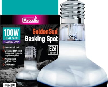 Providing adequate basking temperatures is vital to your new dragon. There are many factors that come into play to ensure this accomplished from the wattage of your heat bulb to the ambient room temperature and even the style of enclosure you choose. We recommend starting with a 100 watt Arcadia GoldenSun Basking Spot Lamp. The light fixture you use should have a dimmer in conjunction with your basking bulb.