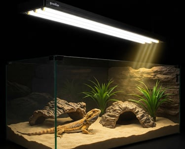 A linear fluorescent UVB and fixture are imperative pieces you need in your enclosure. Your UVB fixture should span half the length of your enclosure. We use and recommend Arcadia T-5 12% bulbs and fixtures.
